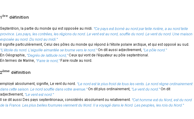 Ancienne définition développée dans dictionnaire académique, 1798.Merci à Paschal et Odile pour la numérisation du mot nord.