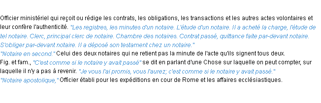 Définition de « notaire » de source académique (Académie Française, parution de 1986).
