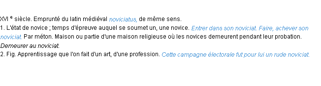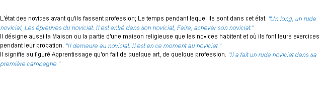 Ancienne signification éditée en 1798 pour le terme « noviciat » par l’Académie Française.Merci à Céleste et Lunete pour la numérisation du mot noviciat.