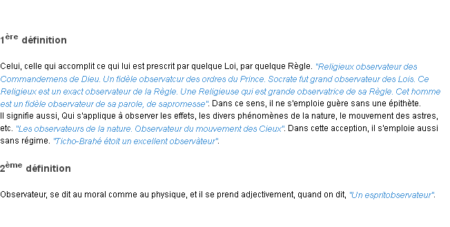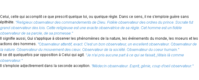 Ancienne signification développée en 1798 par l’académie Française (ACAD - 1798).Merci à Luc et Philippe pour la numérisation du mot observateur.