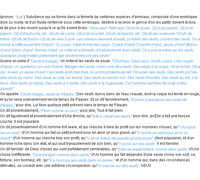 Ancienne définition de l’Académie Française (édition de 1835) pour le mot « oeuf ».