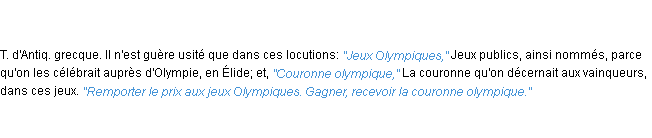 Ancienne signification parue en 1798 dans dictionnaire de l’Académie Française.Merci à Honoré et Héloïse pour la numérisation du mot olympique.