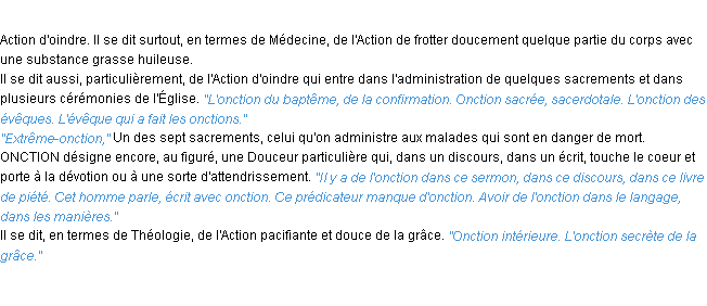 Ancienne signification parue en 1798 dans dictionnaire de l’Académie Française.Merci à Alain et édouard pour la numérisation du mot onction.