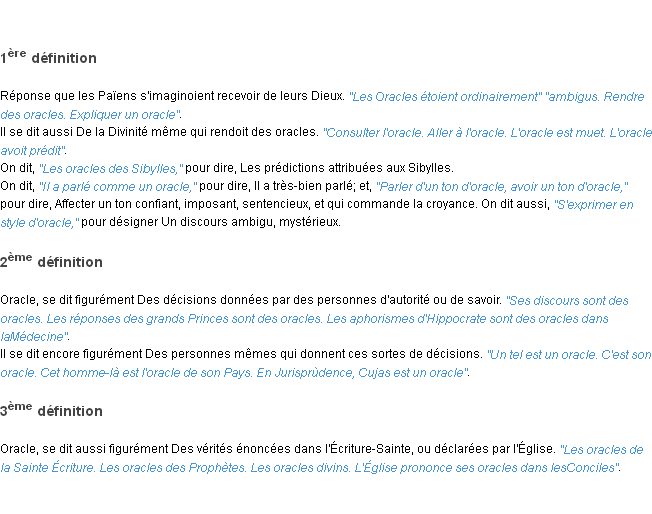 Ancienne signification développée en 1798 par l’académie Française (ACAD - 1798).Merci à Hugues et Théodore pour la numérisation du mot oracle.