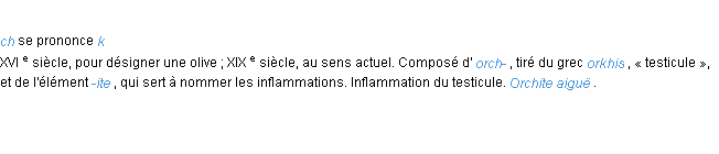 Signification éditée en 1876 pour le terme « orchite » par Emile Littré.Merci à Ignace et Gustave pour la numérisation du mot orchite.
