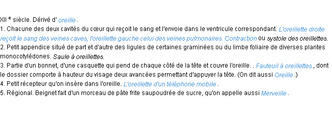 Définition de « oreillette » de source académique (Académie Française, parution de 1986).