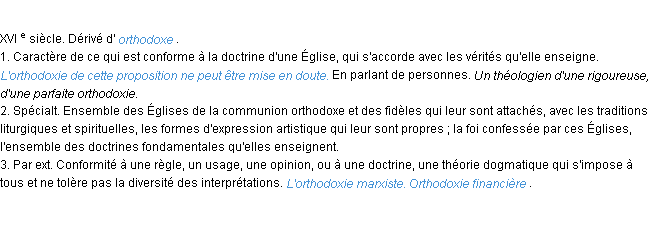 Ancienne signification du terme « orthodoxie », parution de 1798, dictionnaire académique Français.Merci à Pascale et Edwige pour la numérisation du mot orthodoxie.