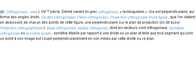 Ancienne signification du terme « orthogonal », parution de 1798, dictionnaire académique Français.Merci à Emmanuelle et Hortense pour la numérisation du mot orthogonal.