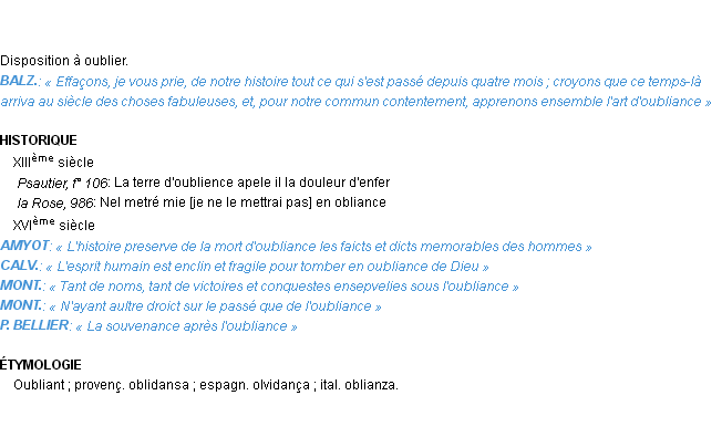 Ancienne définition du mot « oubliance » par l’Académie Française (édition de 1694).Merci à Valérie et Ghislain pour la numérisation du mot oubliance.