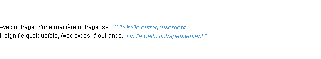 Ancienne signification du terme « outrageusement », parution de 1798, dictionnaire académique Français.Merci à Gwenaelle et Gaspard pour la numérisation du mot outrageusement.