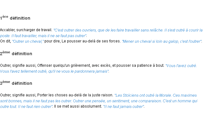 Ancienne signification éditée par l’Académie Française, année 1798.Merci à Léandre et Gaetane pour la numérisation du mot outrer.