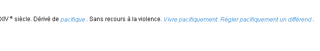 Ancienne signification du terme « pacifiquement », parution de 1798, dictionnaire académique Français.Merci à Apolline et Barnabé pour la numérisation du mot pacifiquement.