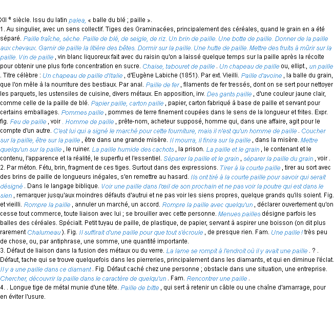 Signification éditée en 1932 pour le terme « paille » par l’Académie Française.