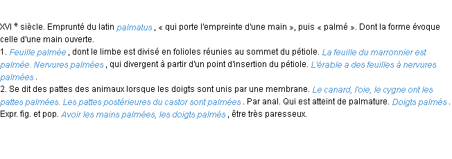 Ancienne définition développée dans dictionnaire académique, 1798.Merci à Josèphe et Mireille pour la numérisation du mot palme.