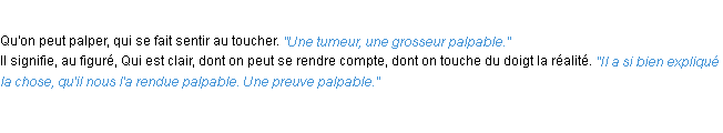 Ancienne signification développée en 1798 par l’académie Française (ACAD - 1798).Merci à Nicolette et Doriane pour la numérisation du mot palpable.