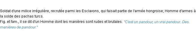Définition développée dans dictionnaire académique, 1932.Merci à Frédérique et Manon pour la numérisation du mot pandour.