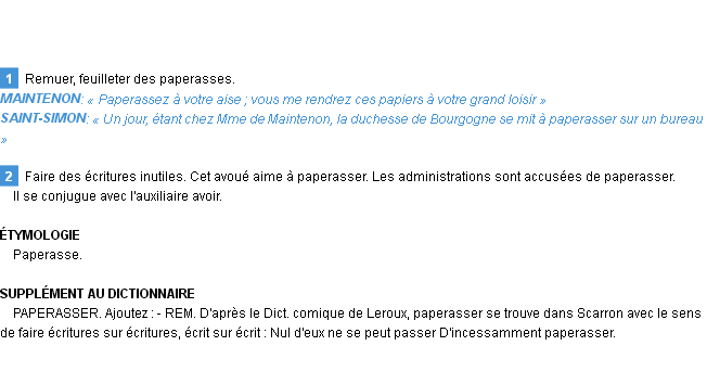 Définition académique pour le terme « paperasser » (parue en 1932).