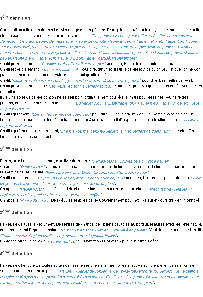 Ancienne signification du terme « papier », parution de 1835, dictionnaire académique Français.