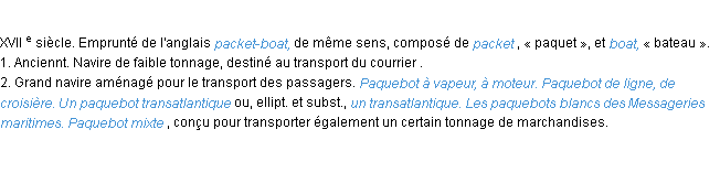Définition académique pour le terme « paquebot » (parue en 1932).