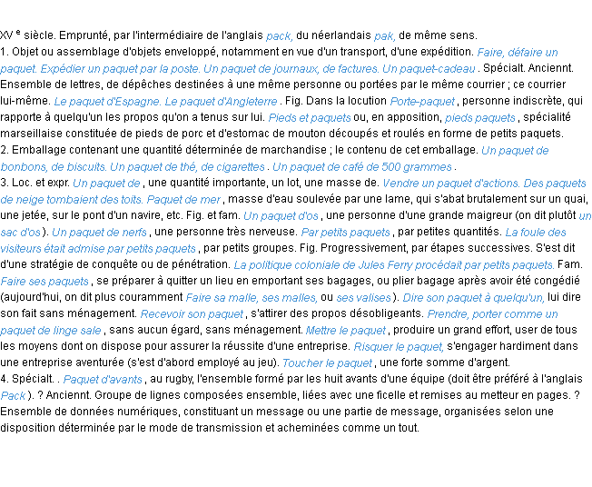 Ancienne définition « paquet » du dictionnaire académique Français, parution de l’année 1835.