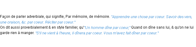 Ancienne signification éditée en 17962 pour le terme « par coeur » par l’Académie Française.Merci à Céline et Benjamine pour la numérisation du mot par coeur.