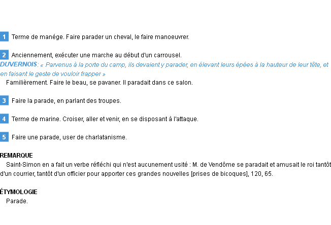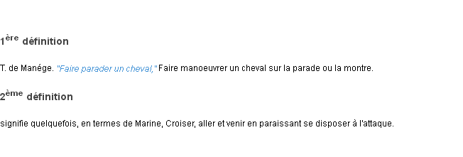 Signification développée en 1876 par Mr Littré (dictionnaire dit d’Emile Littré).Merci à Christelle et Fabienne pour la numérisation du mot parader.
