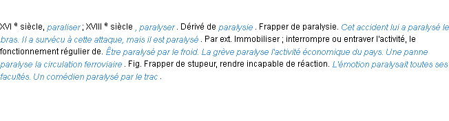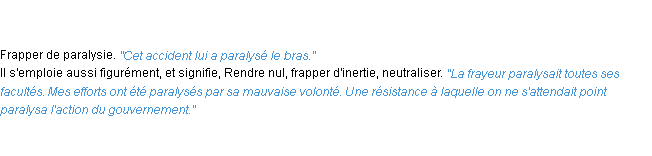 Ancienne signification développée en 1798 par l’académie Française (ACAD - 1798).Merci à Philippe et Sébastien pour la numérisation du mot paralyser.
