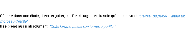 Ancienne signification du terme « parfiler », parution de 1798, dictionnaire académique Français.Merci à Andrée et Paschal pour la numérisation du mot parfiler.