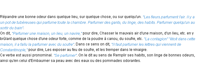 Ancienne signification issue du dico de l’Académie Française, parue en 1798.Merci à Fabienne et Corinne pour la numérisation du mot parfumer.