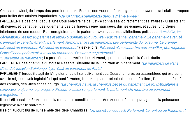 Ancienne signification éditée en 1835 pour le terme « parlement » par l’Académie Française.