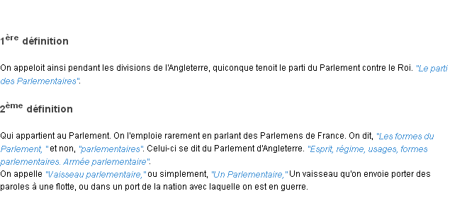 Ancienne signification issue du dico de l’Académie Française, parue en 1798.Merci à Yolande et Delphine pour la numérisation du mot parlementaire.