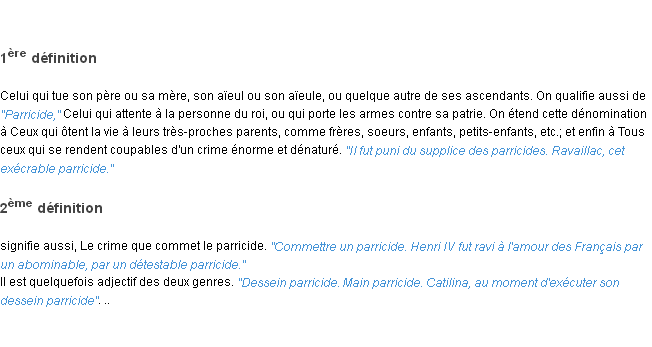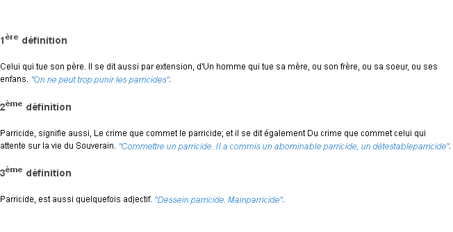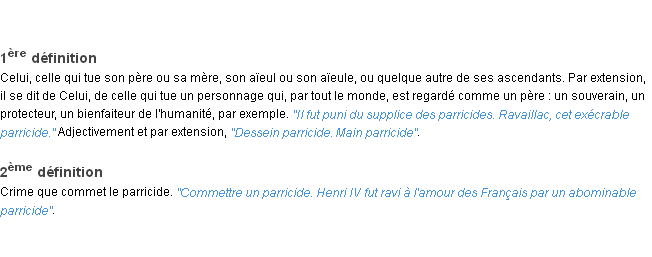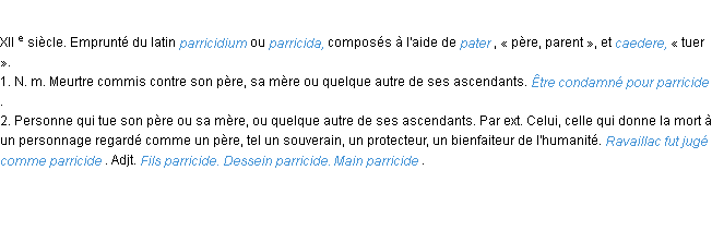 Ancienne signification développée en 1798 par l’académie Française (ACAD - 1798).Merci à Brice et Sacha pour la numérisation du mot parricide.
