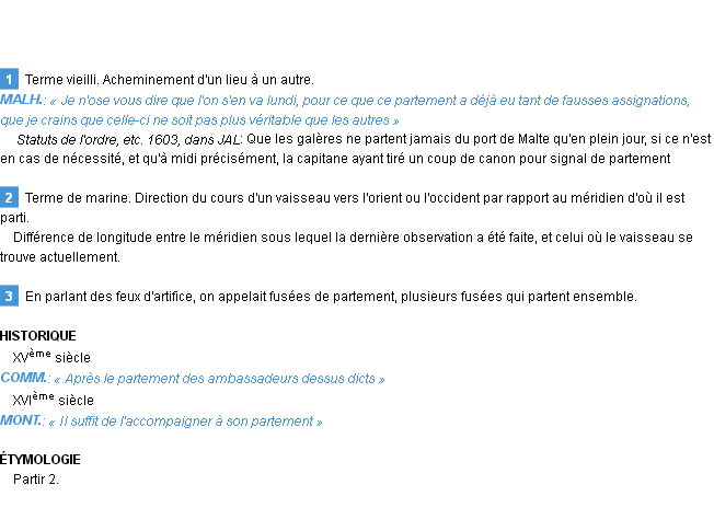 Ancienne définition du mot « partement » par l’Académie Française (édition de 1694).Merci à Gratien et Luce pour la numérisation du mot partement.
