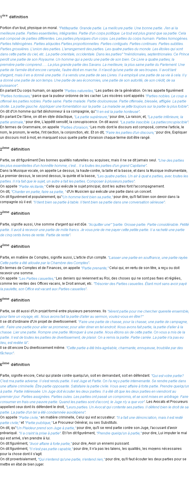 Ancienne définition du mot « partie » par l’Académie Française (édition de 1798).