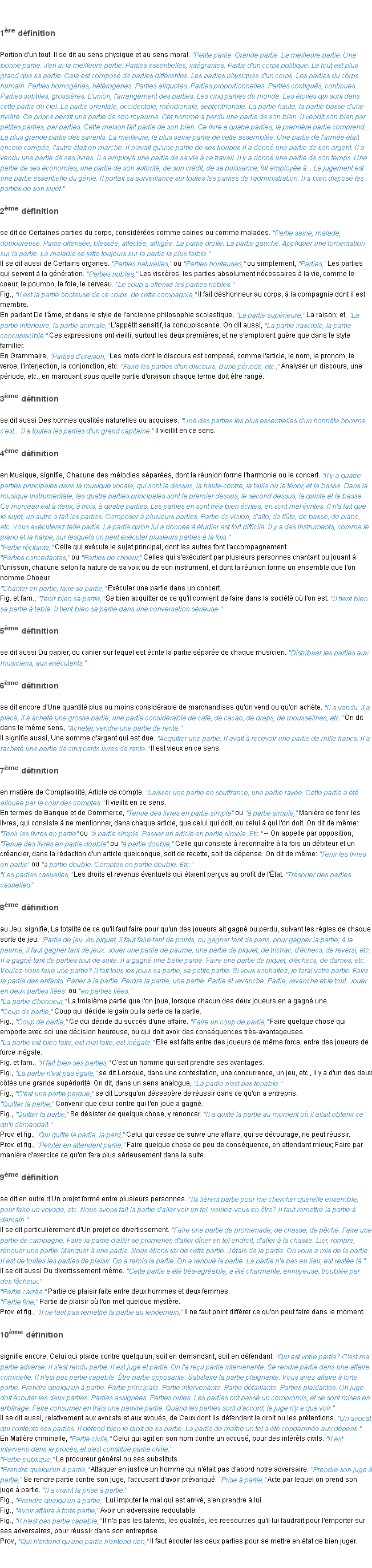 Définition de l’équipe de la-definition.fr (édition de 2009) pour le mot « partie ».Merci à Faustine et Solange pour la numérisation du mot partie.