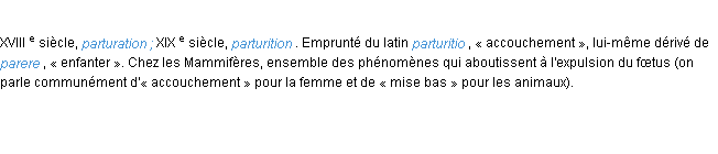 Définition du mot « parturition » (source wiktionary 2011).Merci à Renaud et Honorine pour la numérisation du mot parturition.