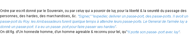 Ancienne définition de « passe-port » de source académique (Académie Française, parution de 1694).Merci à Honorine et Benjamine pour la numérisation du mot passe-port.
