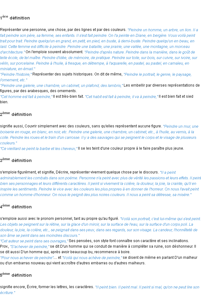 Ancienne signification parue en 1798 dans dictionnaire de l’Académie Française.Merci à Baptiste et Lazare pour la numérisation du mot peindre.