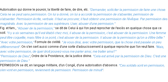 Ancienne définition « permission » du dictionnaire académique Français, parution de l’année 1798.Merci à Honorine et Gaston pour la numérisation du mot permission.