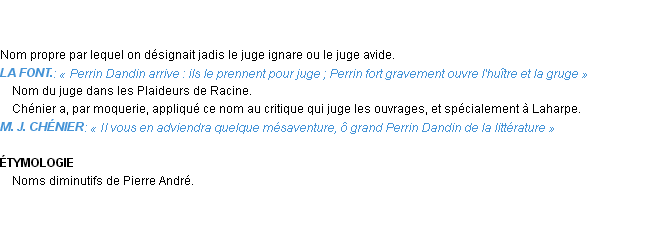 Signification développée en 1876 par Mr Littré (dictionnaire dit d’Emile Littré).Merci à Jérôme et Arnaude pour la numérisation du mot perrin dandin.