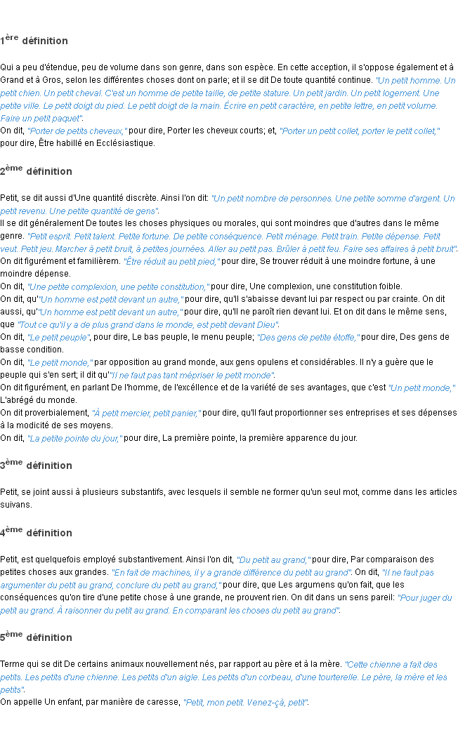 Ancienne définition développée dans dictionnaire académique, 17962.Merci à Sylvain et Sébastien pour la numérisation du mot petit.