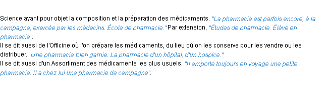 Ancienne signification développée en 1798 par l’académie Française (ACAD - 1798).Merci à Jean-marie et Jacques pour la numérisation du mot pharmacie.