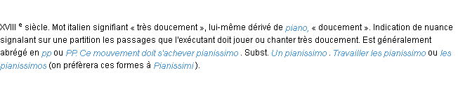 Définition de « pianissimo » issue du Littré (Auteur Emile Littré, édité en 1876).Merci à Amélie et Didier pour la numérisation du mot pianissimo.