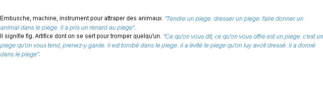 Ancienne signification développée en 1694 par l’académie Française (ACAD - 1694).Merci à éliane et Luc pour la numérisation du mot piege.