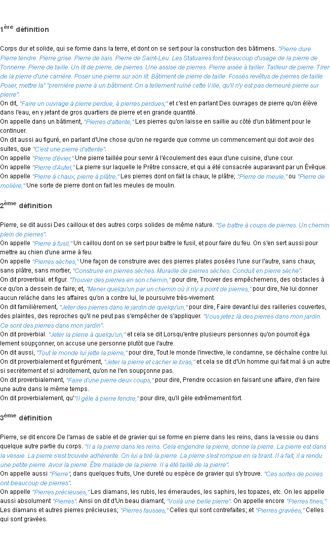 Ancienne définition du mot « pierre » par l’Académie Française (édition de 1835).