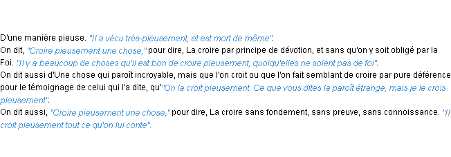Ancienne signification du terme « pieusement », parution de 1798, dictionnaire académique Français.Merci à Stéphanie et Jolie pour la numérisation du mot pieusement.