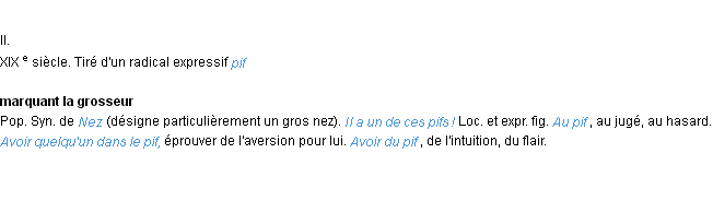 Signification éditée en 1876 pour le terme « pif » par Emile Littré.Merci à Océane et Frédéric pour la numérisation du mot pif.