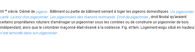 Définition de « pigeonnier » issue du Littré (Auteur Emile Littré, édité en 1876).Merci à Benoit et Christophe pour la numérisation du mot pigeonnier.