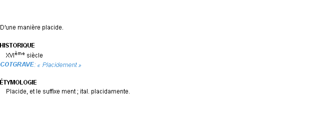 Signification éditée en 1876 pour le terme « placidement » par Emile Littré.Merci à Manon et Lazare pour la numérisation du mot placidement.