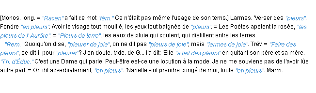 Ancienne définition « pleurs » du dictionnaire académique Français, parution de l’année 17962.